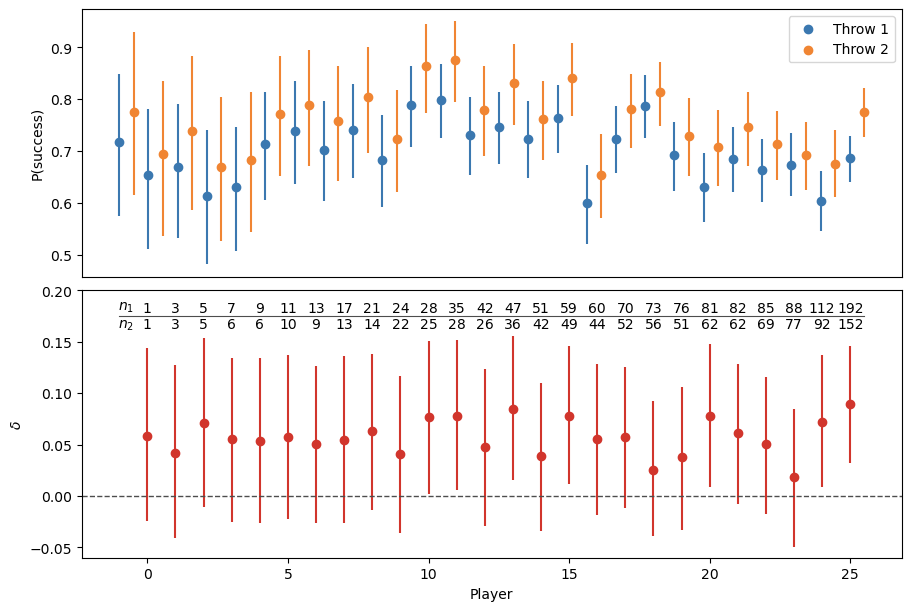 From another perspective, the bottom panel shows that the mean of \(\delta_i\) is always greater than 0. However, it’s only in cases where we have hundreds of attempts that we can conclude, with probability close to 1, that players are indeed better on their second attempts than on their first.