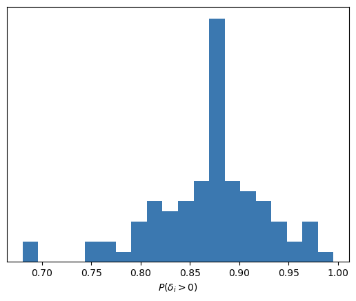 Since we’re Bayesians and use Markov Chain Monte Carlo methods to obtain samples from the posterior, we can compute, for each player, the probability that \(\delta_i\) is greater than 0. With these probabilities, we can build the following summary histogram: