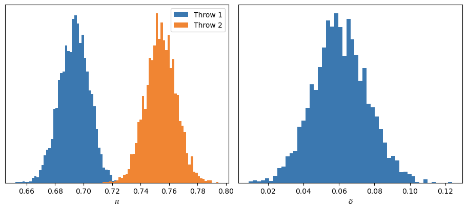 We compute \(\delta\) as the difference between \(\pi_2\) and \(\pi_1\), and then analyze the marginal posterior distributions.