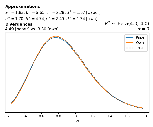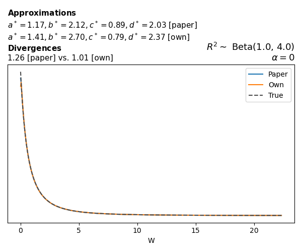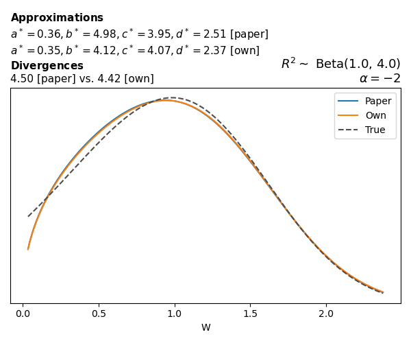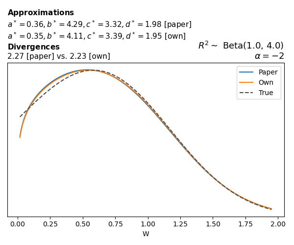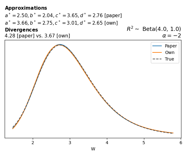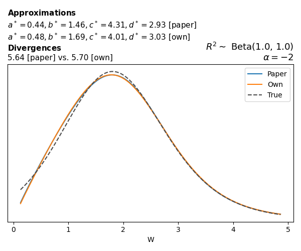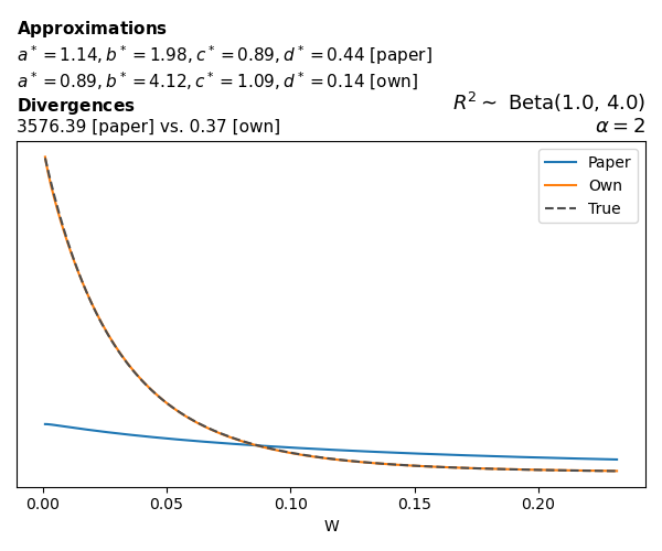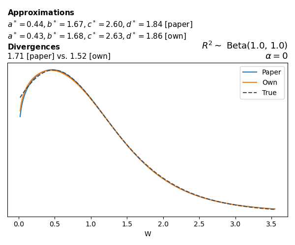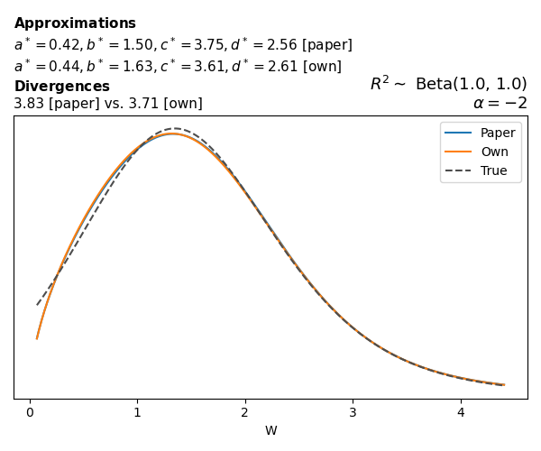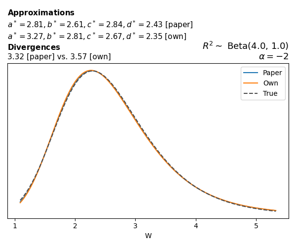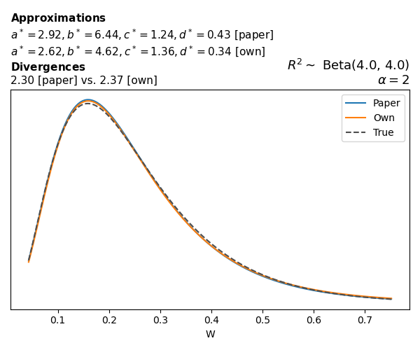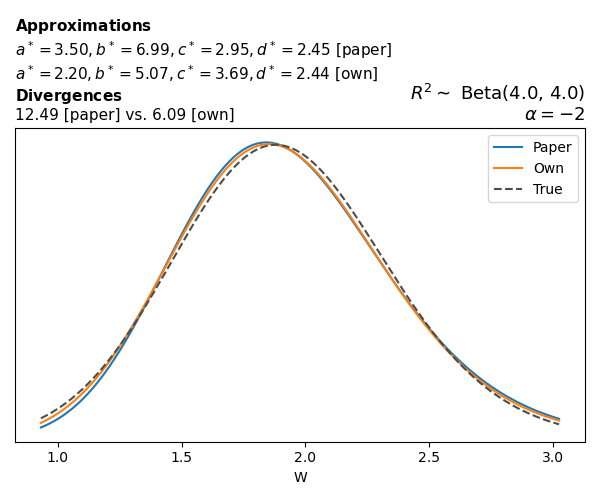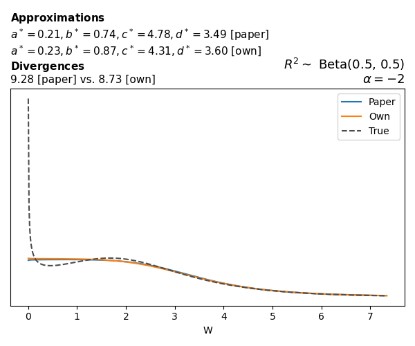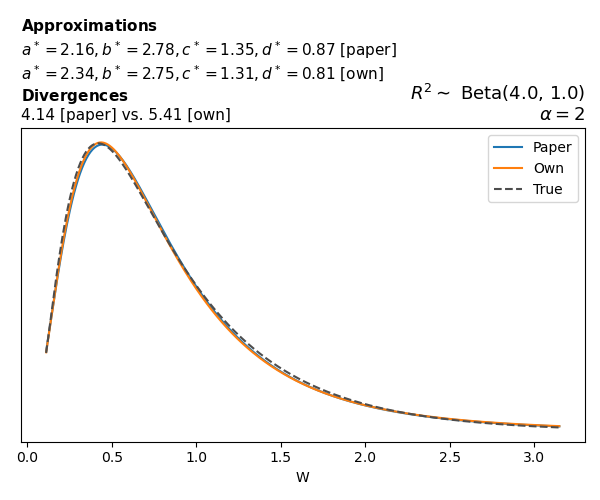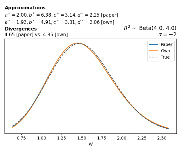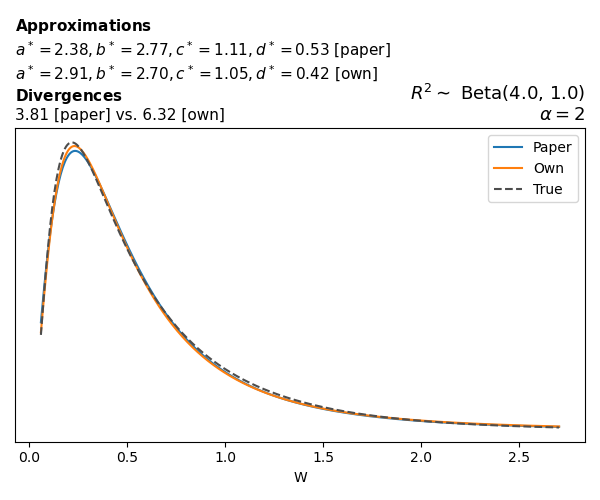 Suppose \(p(w)\) is the density function of the distribution on \(W\) that yields exactly \(R^2 \sim \text{Beta}(a, b)\). To obtain the values of the parameters of the GBP distribution, the authors minimize the Pearson \(\chi^2\) divergence between the true density \(p(w)\) and its GBP approximation \(p_{GBP}(w)\), with an added regularization term that shrinks the solution toward \(\text{GBP}(a^*, b^*, 1, 1)\), which is the exact solution for certain model families and can be considered the baseline.