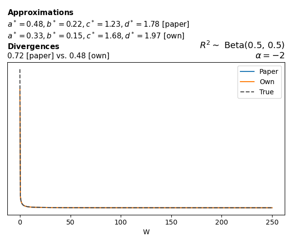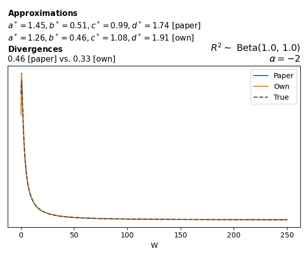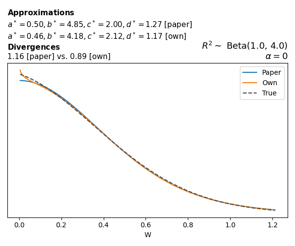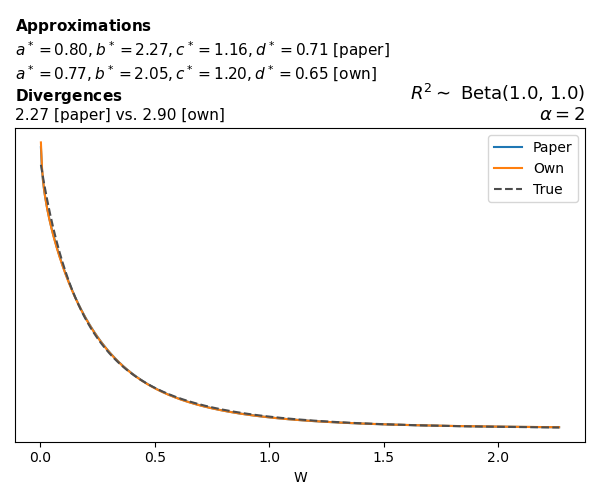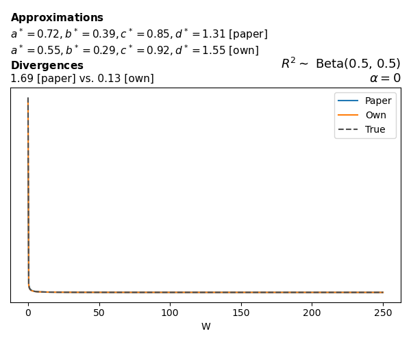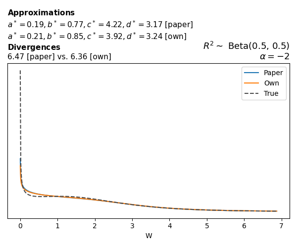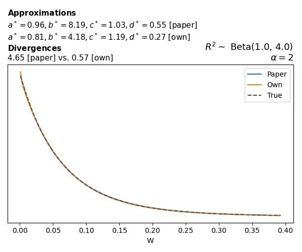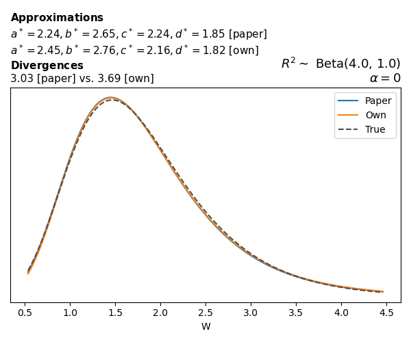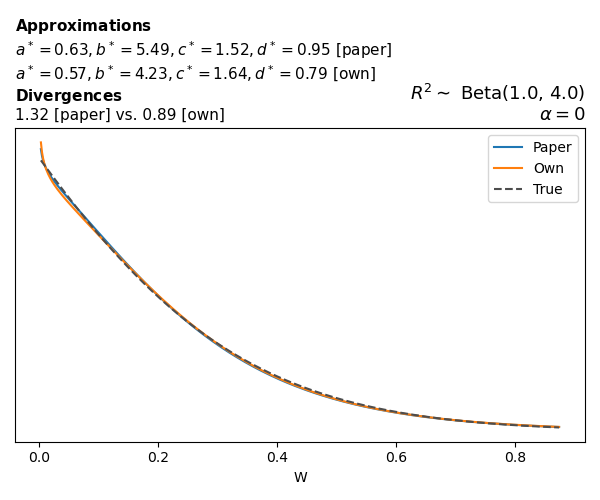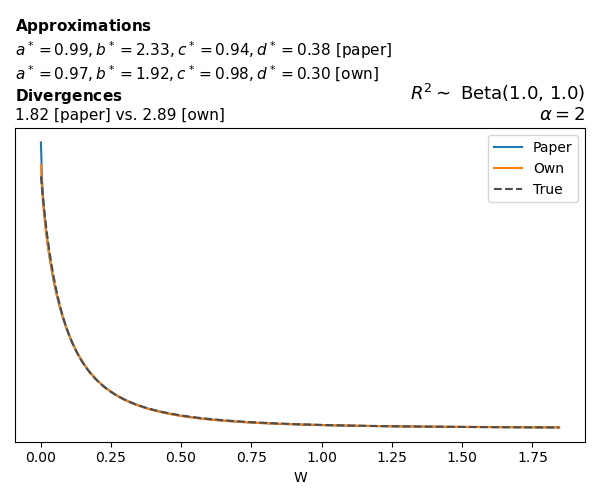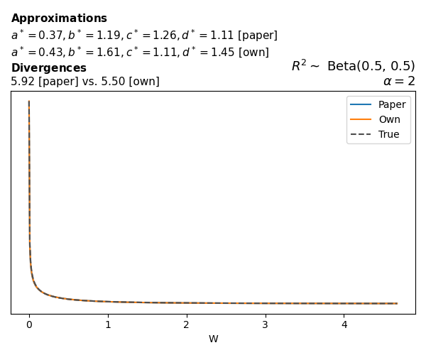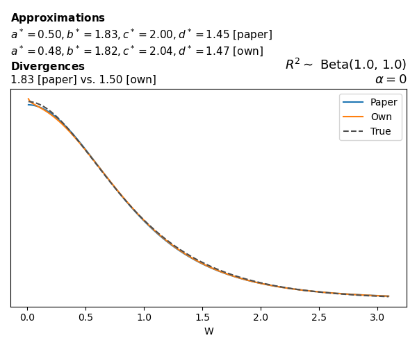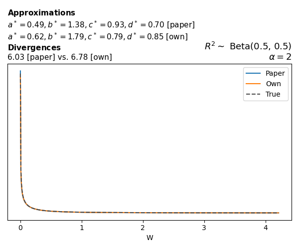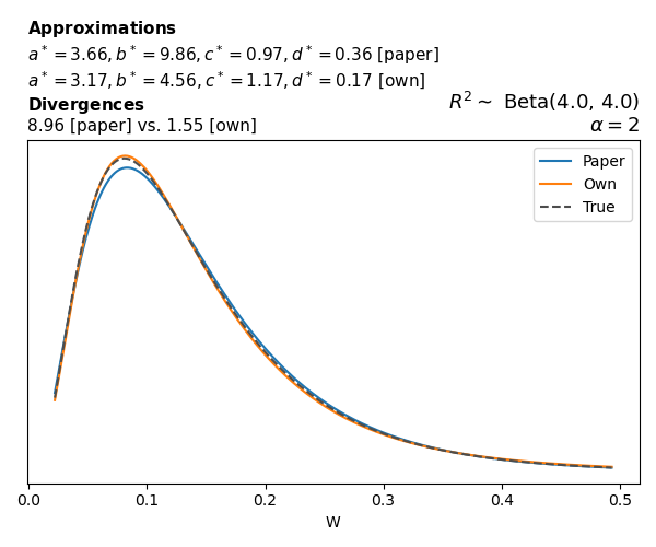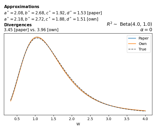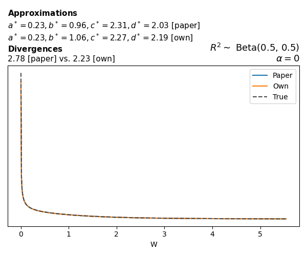 Suppose \(p(w)\) is the density function of the distribution on \(W\) that yields exactly \(R^2 \sim \text{Beta}(a, b)\). To obtain the values of the parameters of the GBP distribution, the authors minimize the Pearson \(\chi^2\) divergence between the true density \(p(w)\) and its GBP approximation \(p_{GBP}(w)\), with an added regularization term that shrinks the solution toward \(\text{GBP}(a^*, b^*, 1, 1)\), which is the exact solution for certain model families and can be considered the baseline.